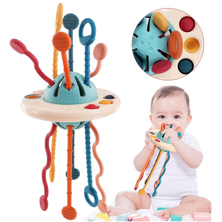 Silikonowa zabawka do ciągnięcia montessori ufo wykorzystuje jasne kolory, aby stymulować wizualny wzrost dziecka. Kształt samolotu ułatwia niemowlętom chwytanie i trzymanie, słuchanie i odczuwanie różnych dźwięków i wibracji oraz przeciąganie przewodów z jednej strony na drugą. Zdolności motoryczne, eksploracja sensoryczna, precyzyjna motoryka i koordynacja ręka-oko są wspierane przez używanie teksturowanych lin i uchwytów.
